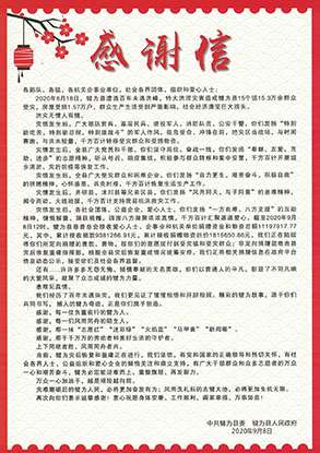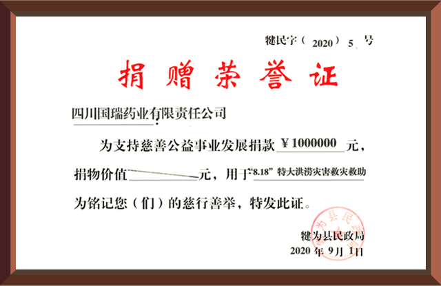 2020年8月18日,四川省犍为县遭遇百年未遇特大洪涝灾害,星空官方站登录入口-星空(中国)集团国瑞药业向犍为县灾区捐赠现金100万元。